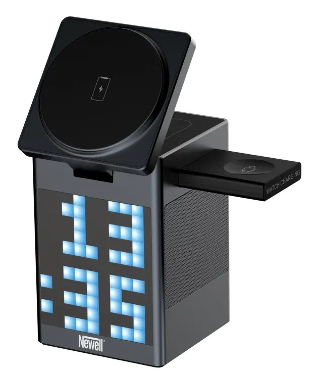 A Newell induOne MagPlay egy sokoldalú töltőállomás, ami ötvözi a vezeték nélküli töltést három különböző eszközhöz (okostelefon, okosóra, fülhallgató), egy Bluetooth hangszórót és egy ébresztőórát. A MagSafe mágneses rögzítés stabil tartást biztosít, így a telefonodat függőlegesen vagy vízszintesen is töltheted. A 110 RGB LED-del ellátott kijelző lenyűgöző pixel art animációkat jelenít meg, mutatja az időt, és akár három ébresztést is beállíthatsz rajta. A beépített hangszóró a Bluetooth 5.3 technológiával tiszta, sztereó hangzást biztosít, a beépített 1000 mAh-s akkumulátor pedig lehetővé teszi a vezeték nélküli használatot. Az equalizer mód a zene ritmusára mozgó animációkat vetít a kijelzőre. A masszív alumínium burkolat pedig nemcsak tartósságot, hanem elegáns megjelenést is kölcsönöz az eszköznek – tökéletesen illik bármilyen modern környezetbe.