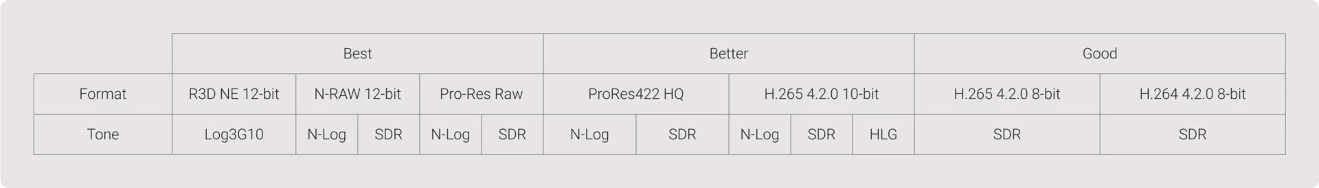 119,88p (3340 Mbps), 100p (2800 Mbps), 59,94p (1670 Mbps), 50p (1400 Mbps), 29,97p (840 Mbps), 25p (710 Mbps), 23,97p (680 Mbps)