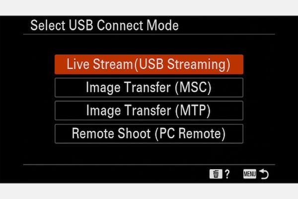 Alpha7 IV - egyszerű live streaming. Ha USB-n keresztül csatlakozol egy számítógéphez, felugrik az USB-funkció-választó menü a kijelzőn. Válaszd a „Live Stream (USB Streaming)” lehetőséget, és a gép azonnal átvált erre a módra bármilyen egyéb teendő nélkül.