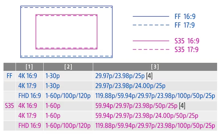4096 x 2160 (4:2:2, 10 bit) (kb.): 59,94p (600 Mbps), 29,97p (300 Mbps), 23,98p (240 Mbps), 50p (500 Mbps), 25p (250 Mbps), 24,00p (240 Mbps)