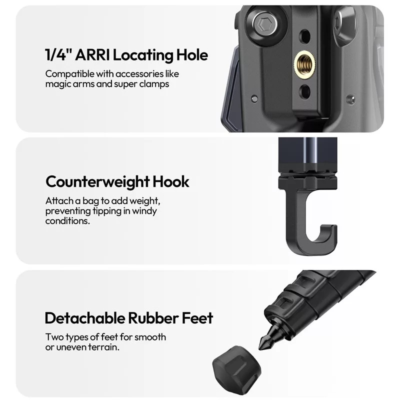 Állítható lábszögek: a lábak többféle pozícióba állíthatók, így alacsony szögű vagy szabálytalan felületen történő felvételkészítéshez is ideális.